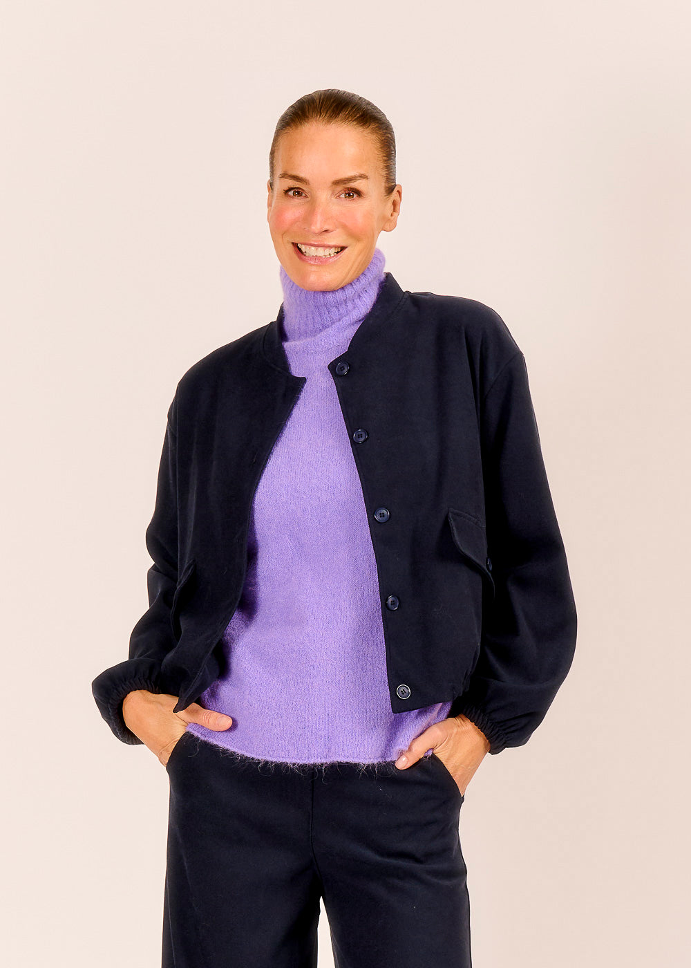 Dieser lässige Bomberino in tiefem Dunkelblau passt einfach zu jedem Outfit. Der moderne Schnitt mit raffinierten Details sorgt für einen stilvollen, urbanen Look. In Kombination mit der passenden Hose wirkt er besonders edel.