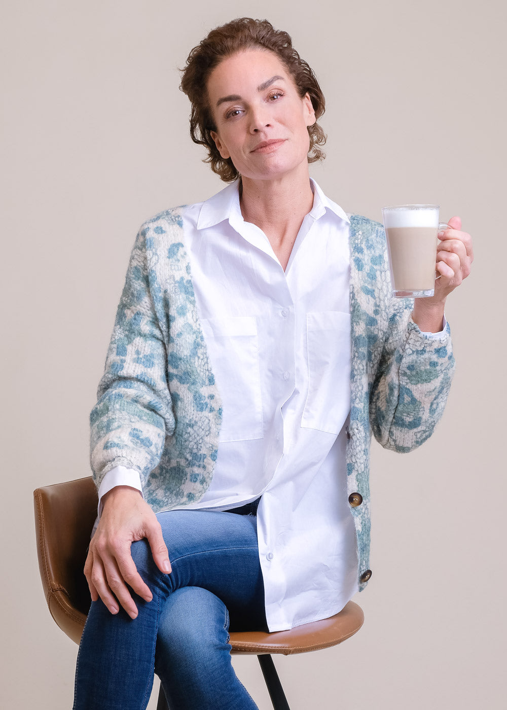 Kurz geschnittener Strickcardigan mit Wollanteil und V-Ausschnitt. Mit Knöpfen und einem modernen Druck. Ein absoluter Hingucker.