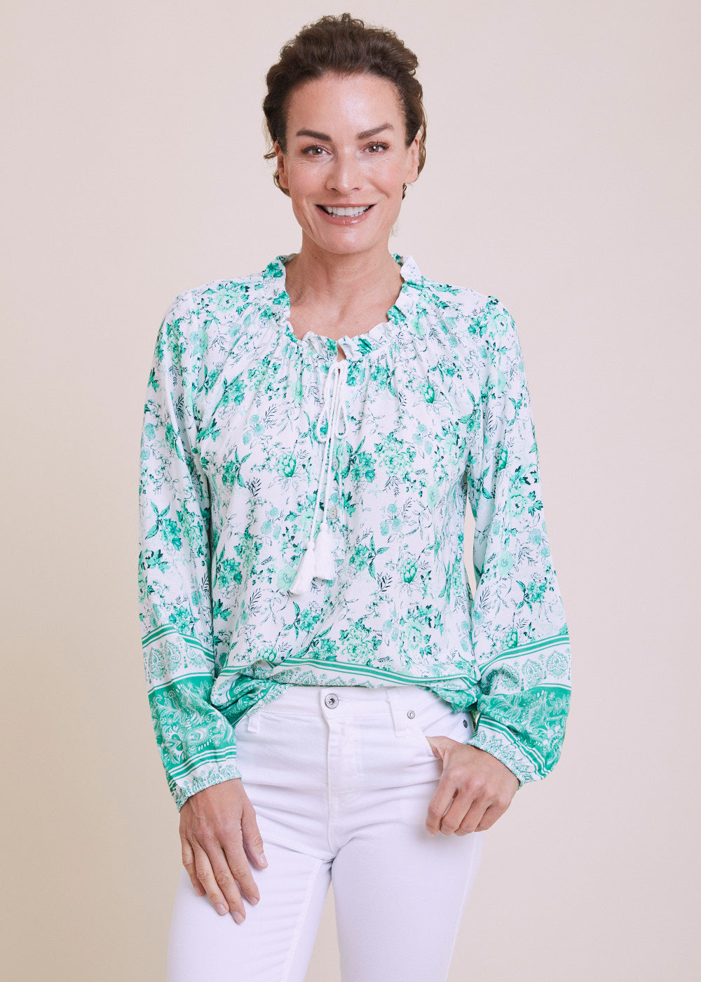 Fließende und verspielte Tunika aus einem großartigen Viskosematerial. Etwas länger und legerer geschnitten mit V-Öffnung und Bindebändchen am Rundhals-Ausschnitt. Vorne kürzer geschnitten als hinten. Länge:70cm.