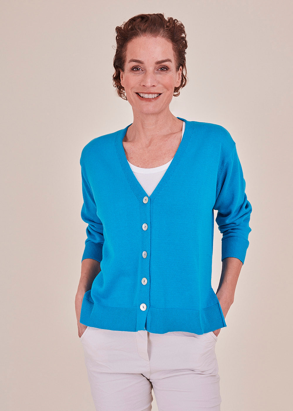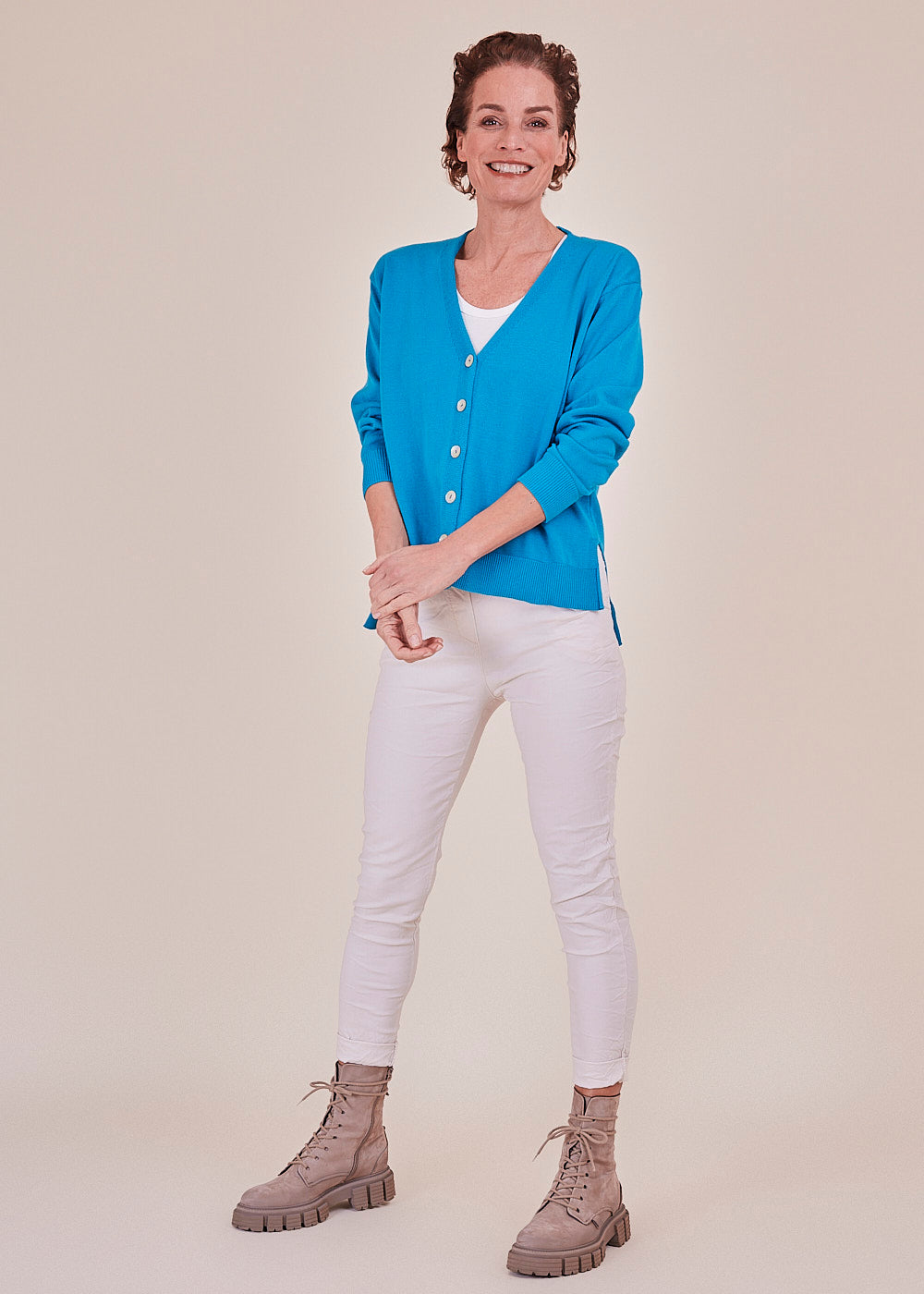Kurz und kastenförmig geschnittene Strickjacke mit langen Armen aus unserem Bestseller Garn. Sie hat ein Rippenbündchen an den Ärmeln und am Saum. Durch die Frontknöpfe lässt sich diese Jacke wunderbar geschlossen tragen. Zum darunter tragen empfehlen wir dir unsere Basic Tops. Kuschelig weicher Tragekomfort mit absoluter Wohlfühlgarantie.