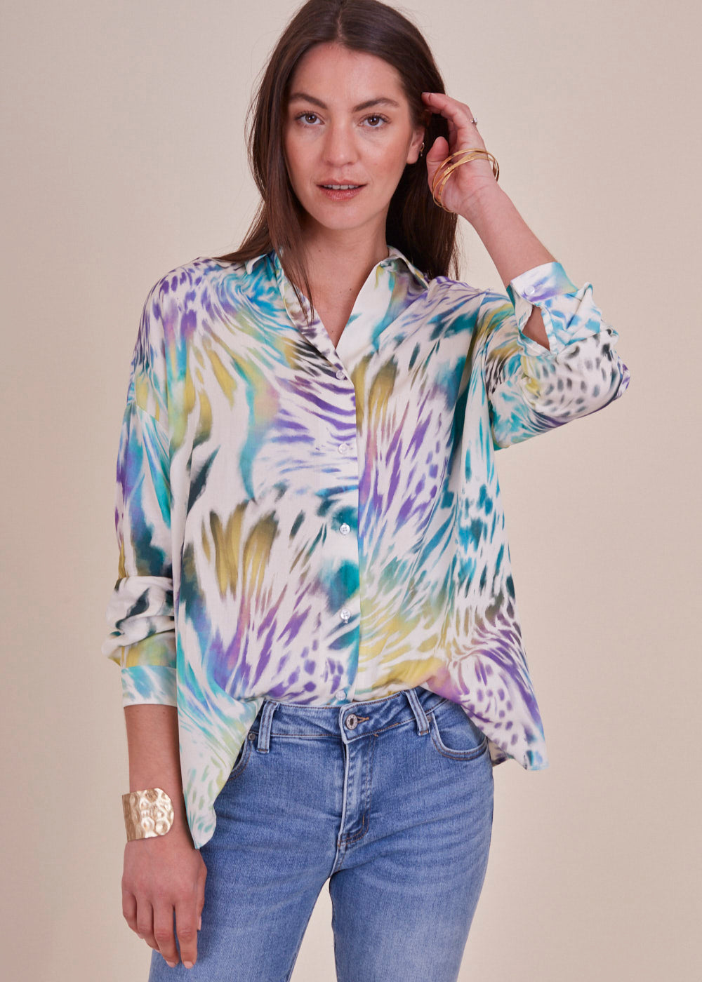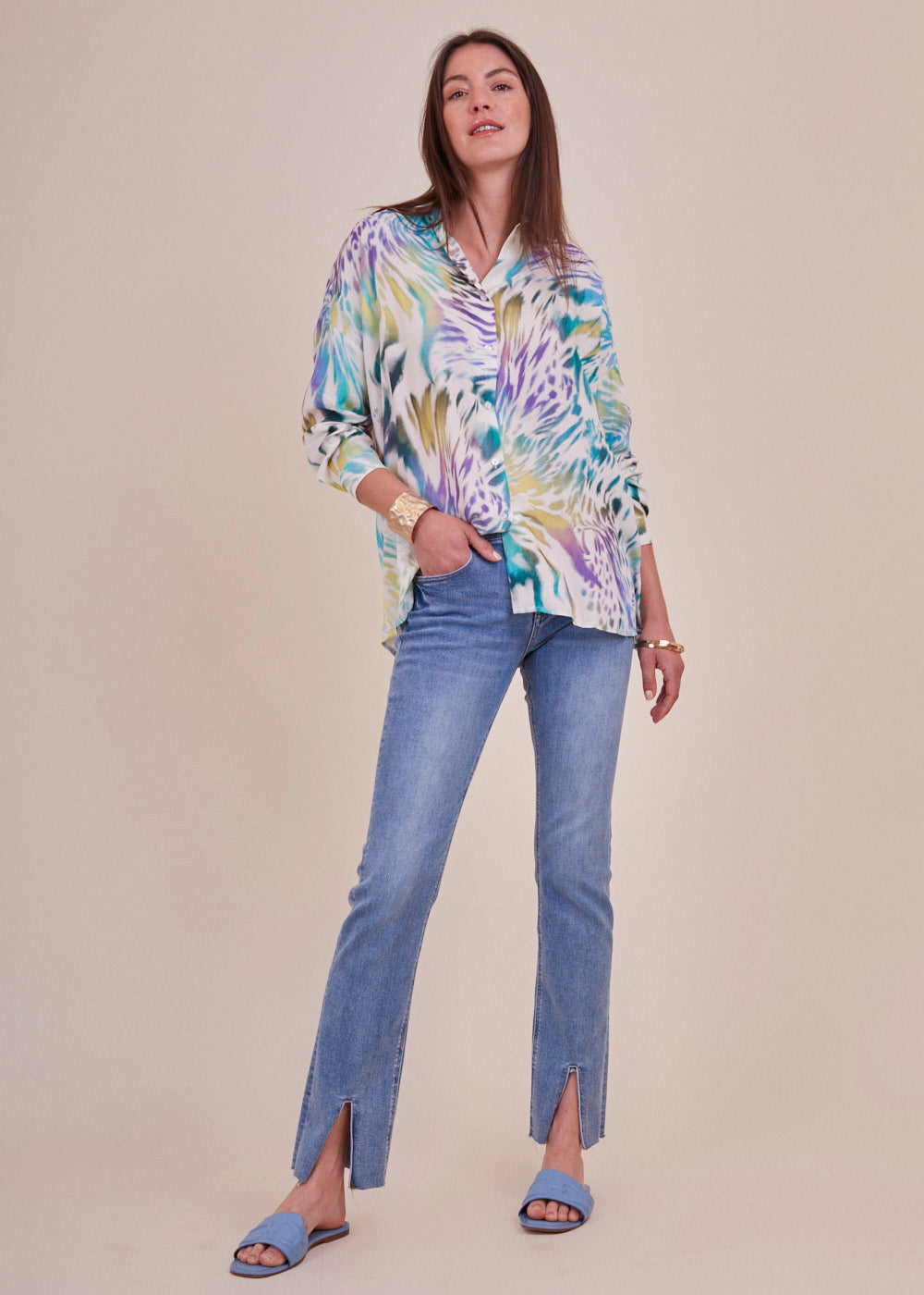 Diese gemusterte Bluse im Hemdkragen Stil ist lässig geschnitten. Die frischen Farben verleihen deinem Look die perfekte Frische. Einfach besonders!