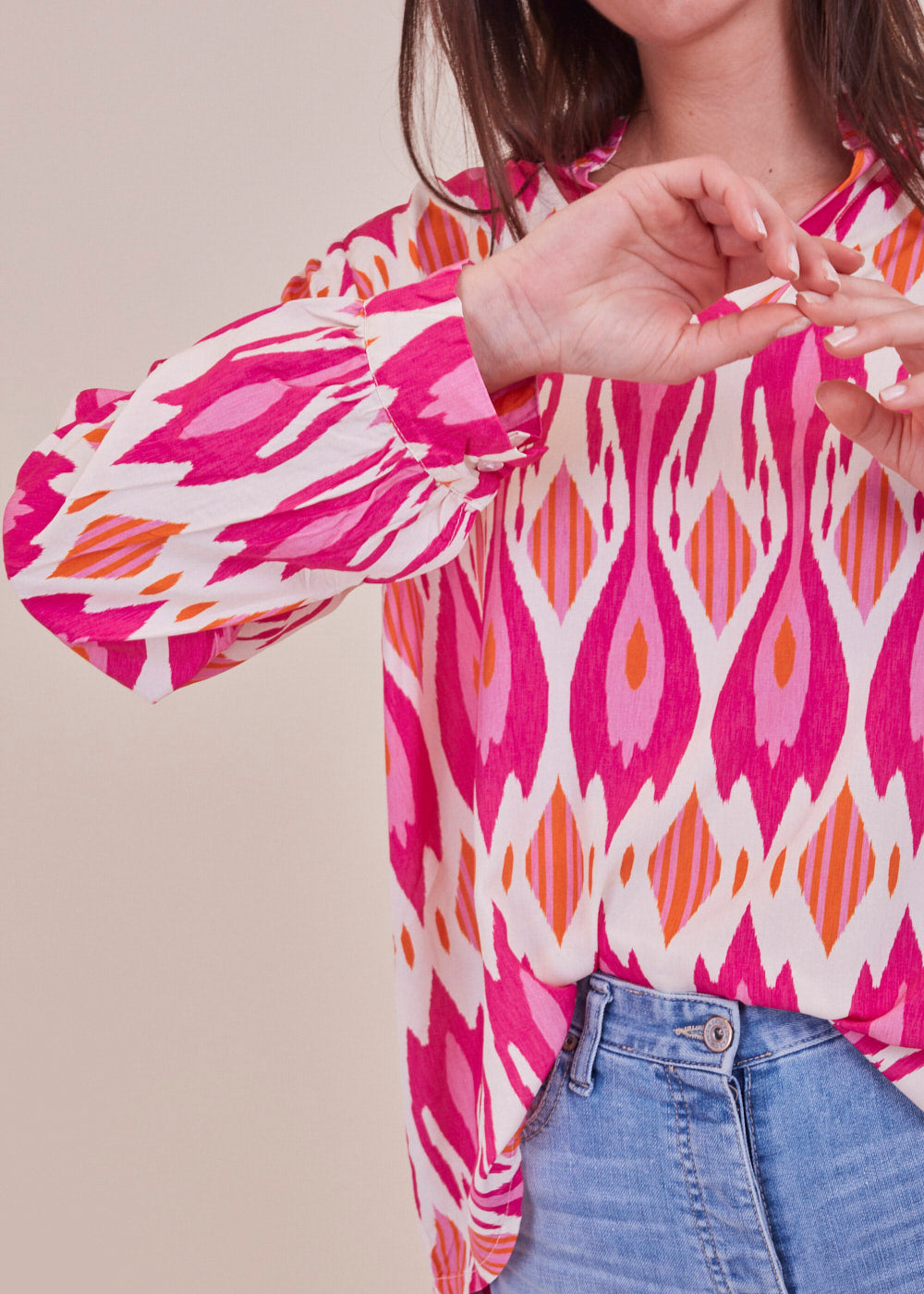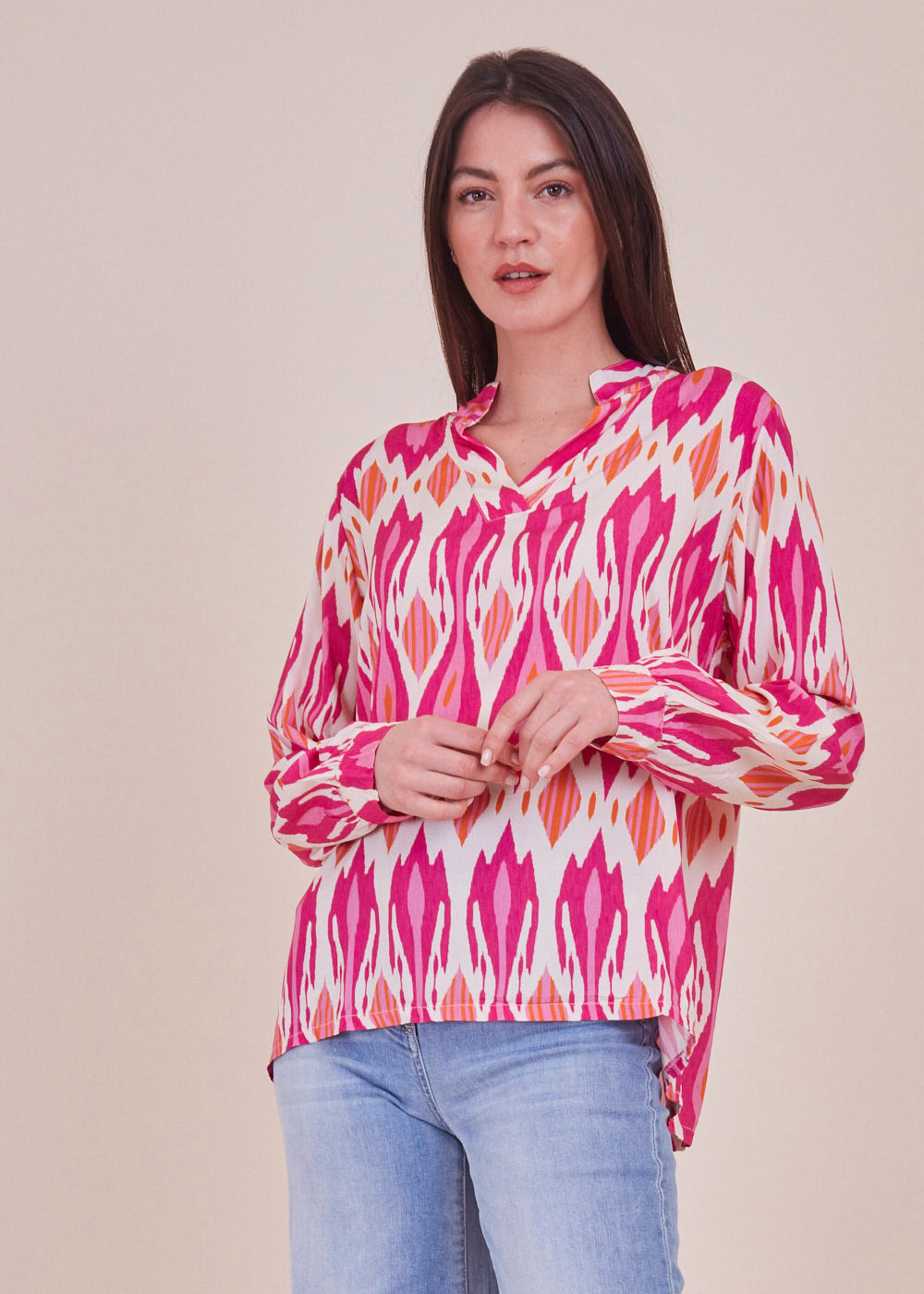 Wir lieben Print! Diese lässig fließende Viskosebluse in den neuen Trendfarben hat lange Ärmel mit überschnittenen Schultern. Durch ihr leichtes Viskosematerial hat sie einen angenehmen Tragekomfort. Sie hat durchgehende Knopfleiste. Ein absoluter Hingucker.