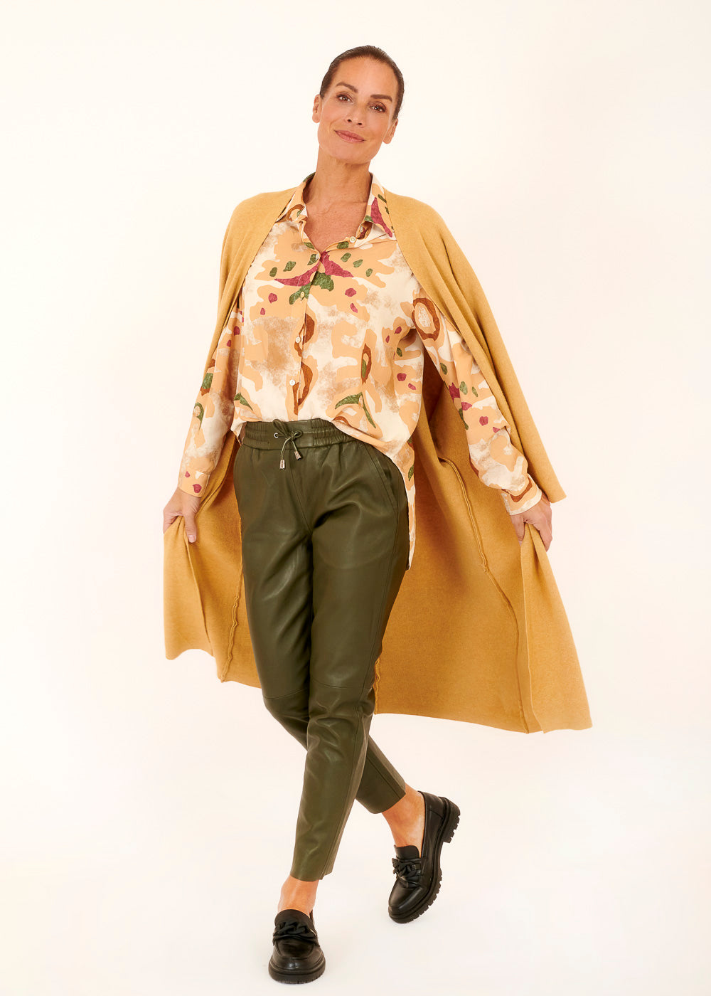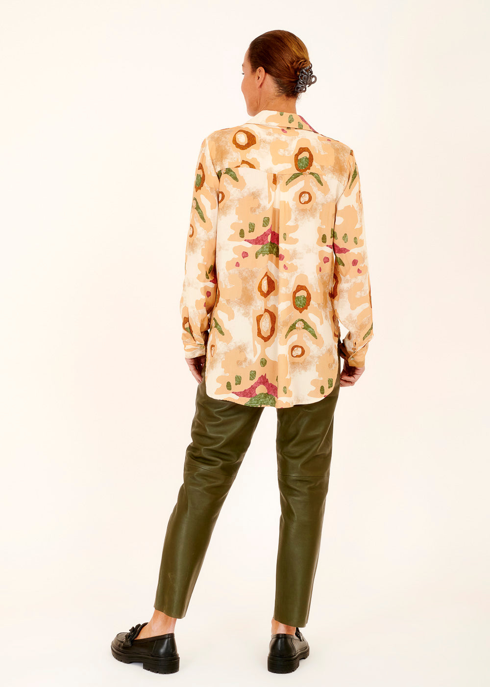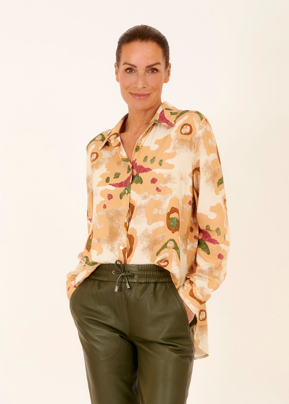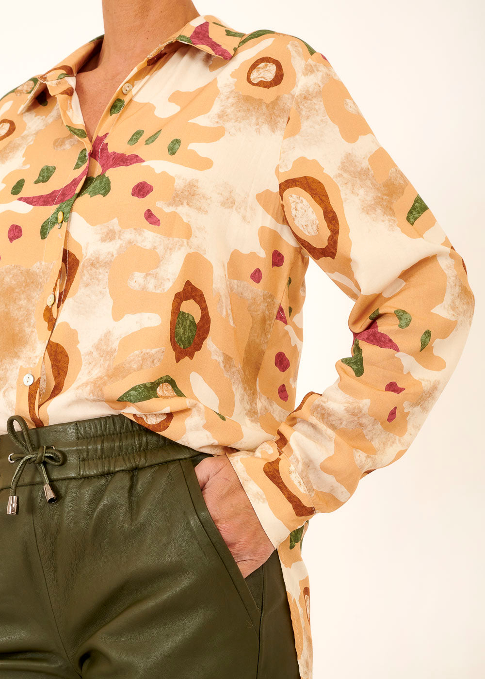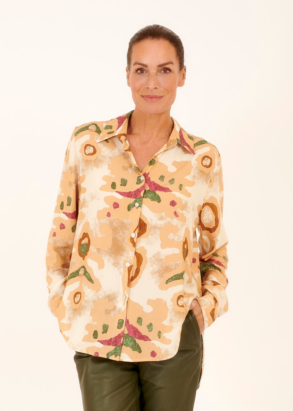 Lässige Viskosebluse mit angesamtem Herbstdruck. In Hemdblusenform. Mit einer schicken Jacke oder einem Cardigan darüber verwandelst du die Bluse im Handumdrehen in ein wärmendes Outfit für kühlere Herbstabende.