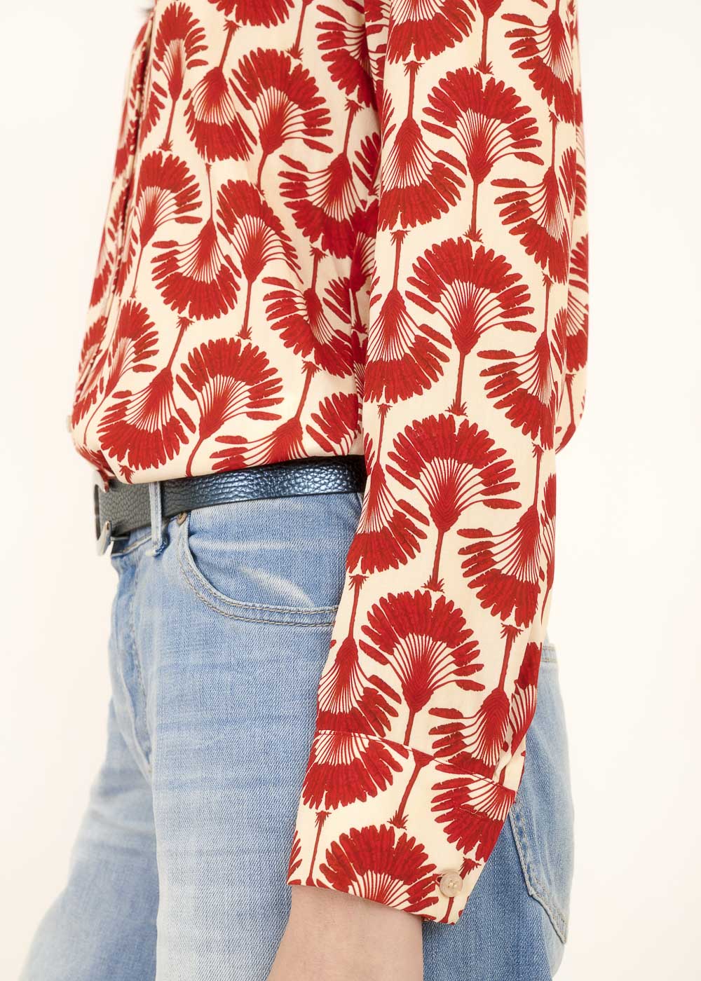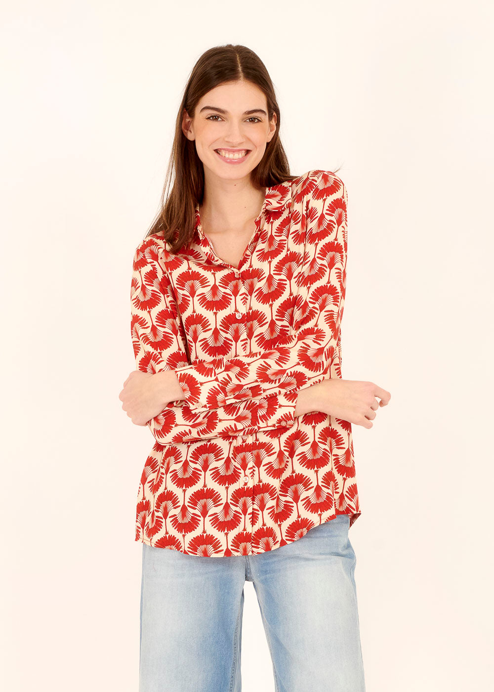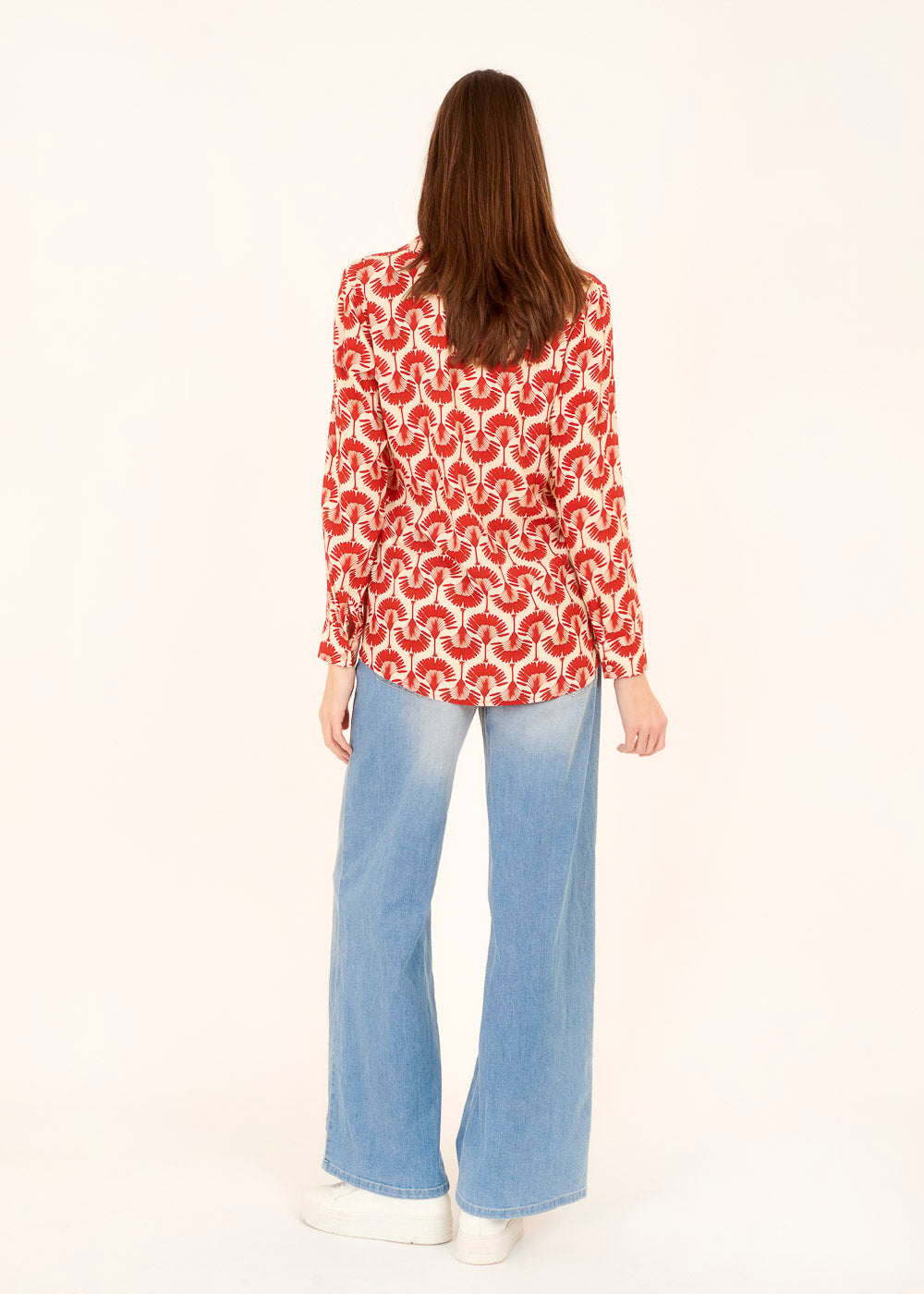 Bereichere deinen Kleiderschrank mit unserer stylischen Bluse im Hemdkragenstil. Das weiße Design mit rotem Muster verleiht diesem Kleidungsstück einen frischen und zugleich eleganten Touch.