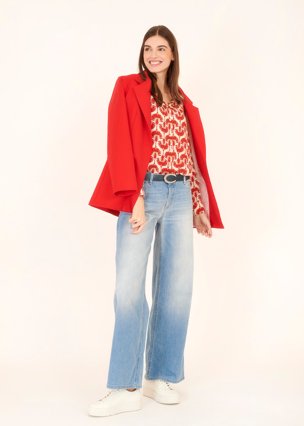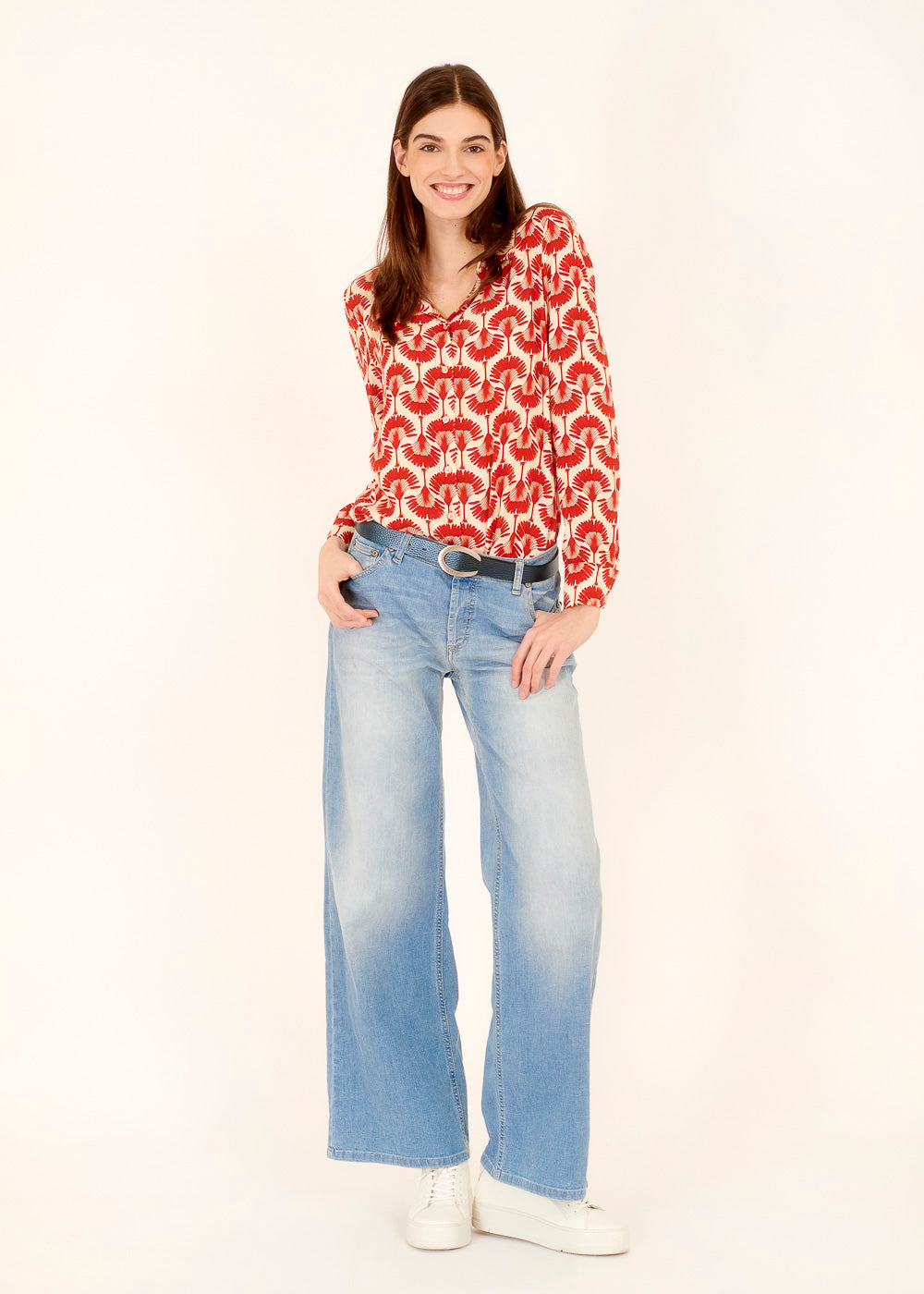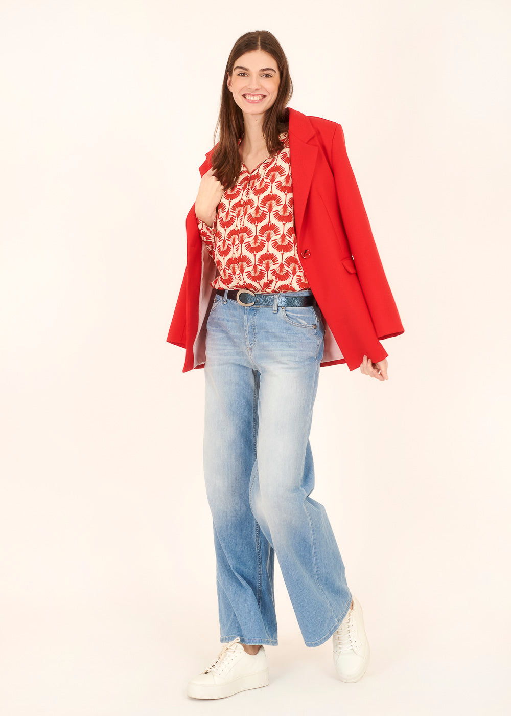 Bereichere deinen Kleiderschrank mit unserer stylischen Bluse im Hemdkragenstil. Das weiße Design mit rotem Muster verleiht diesem Kleidungsstück einen frischen und zugleich eleganten Touch.