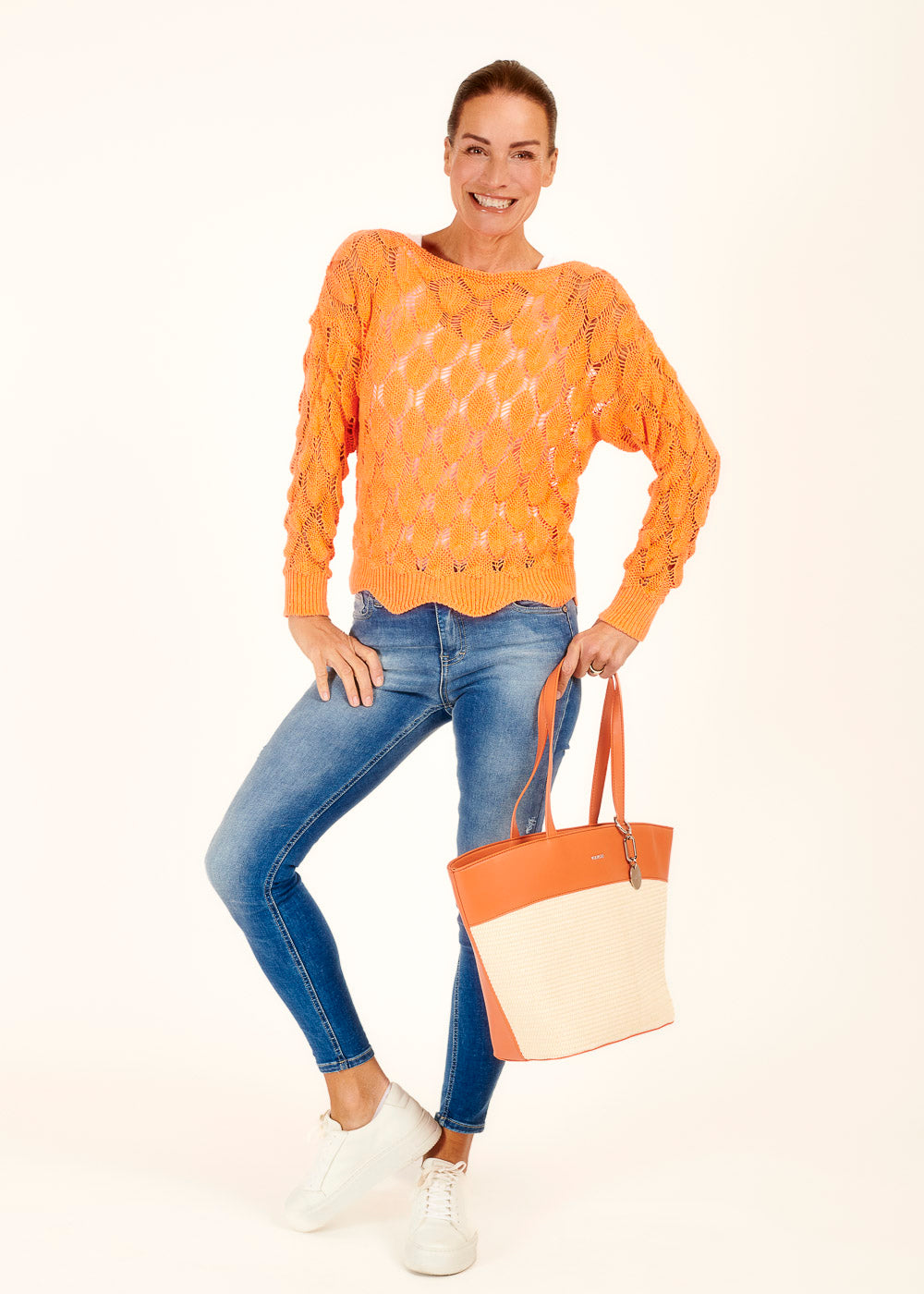Tauche ein in die Welt des raffinierten Stils mit unserem bezaubernden Ajour-Pullover in lebendigem Orange.