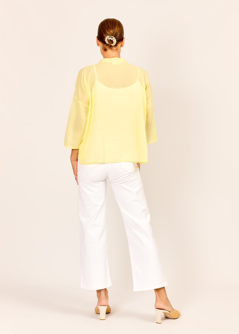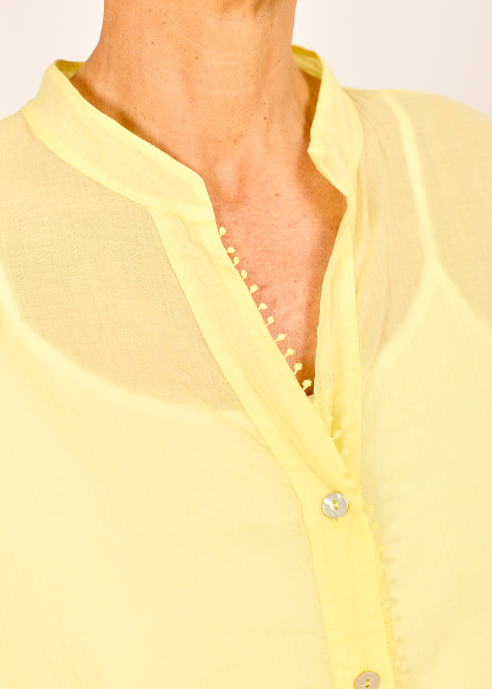 Hauche deinem Look mit dieser wunderschönen Batist-Tunika in zartem Giallino neues Leben ein. Das leichte, durchscheinende Material umschmeichelt die Figur und sorgt für ein luftig-leichtes Tragegefühl, perfekt für warme Tage. Mit ihrem edlen Stehkragen und den dezenten Knöpfen ist sie ein vielseitiges Key-Piece, das Eleganz und lässige Leichtigkeit spielend vereint.